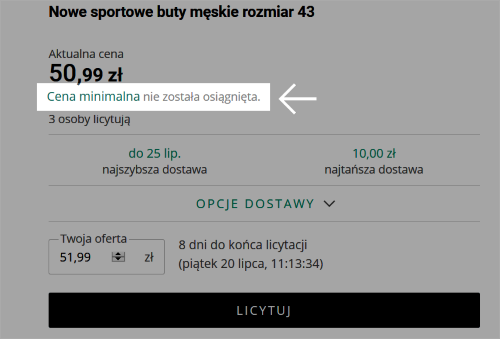 Składając ofertę musimy pamiętać że musi być ona wyższa niż aktualnie już osiągnięta w aukcji. 10 zł 17 gr 25 zł 28 gr. Podczas licytacji warto podać kwotę znacznie wyższą niż ta która pozwoli jedynie na przebicie oferty aktualnie wygrywającego licytację.