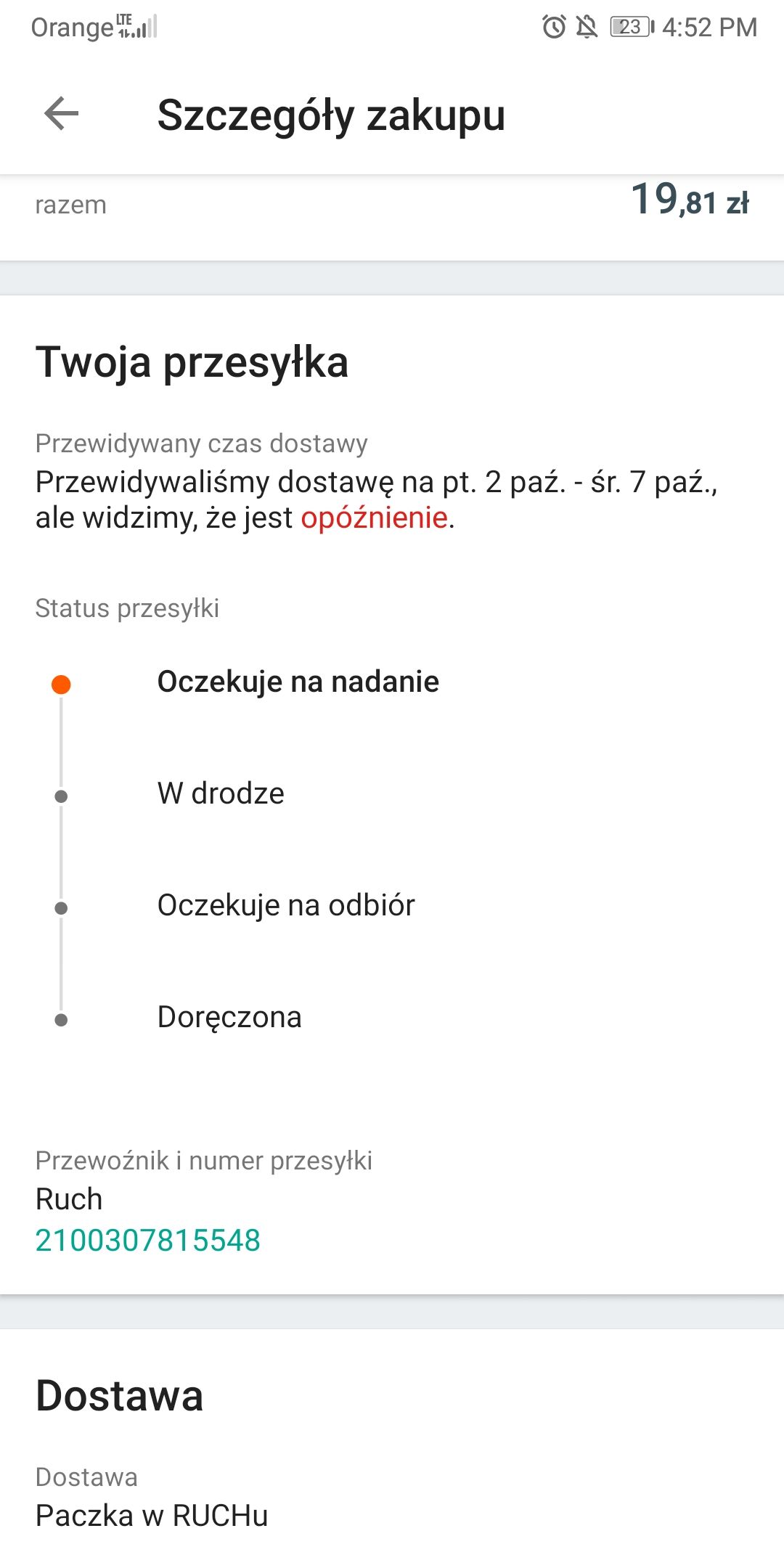 Do tej pory towaru nie. Jesli zamówiona przesyłka do Ciebie nie dotarła najpierw upewnij się czy sprzedający otrzymał Twoją wpłatę czy czas dostawy podany w ofercie rzeczywiście minął. Gdzie to można zgłosić.